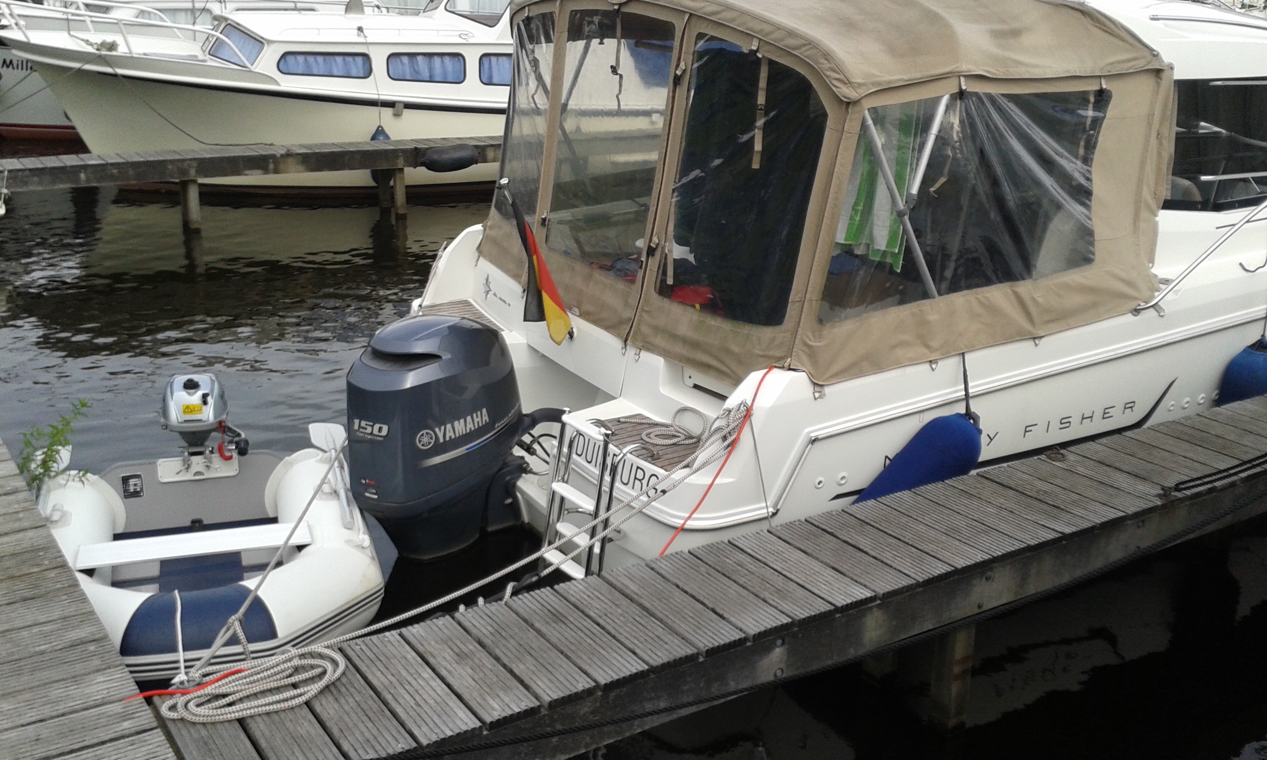 Gegen halb sieben stehen wir auf. Wie immer, wenn wir zu zweit auf dem Boot sind, geht einer duschen, während der andere in der Zeit das Boot klar macht. Geht der andere duschen wird in dieser Zeit das Frühstück, hier Müsli und Kaffee vorbereitet, dann wird gemeinsam gefrühstückt. Heute gibt es eine Premiere, das Beiboot kommt erstmals inklusive dem 2,5 PS Außenbordmotor zum Einsatz.