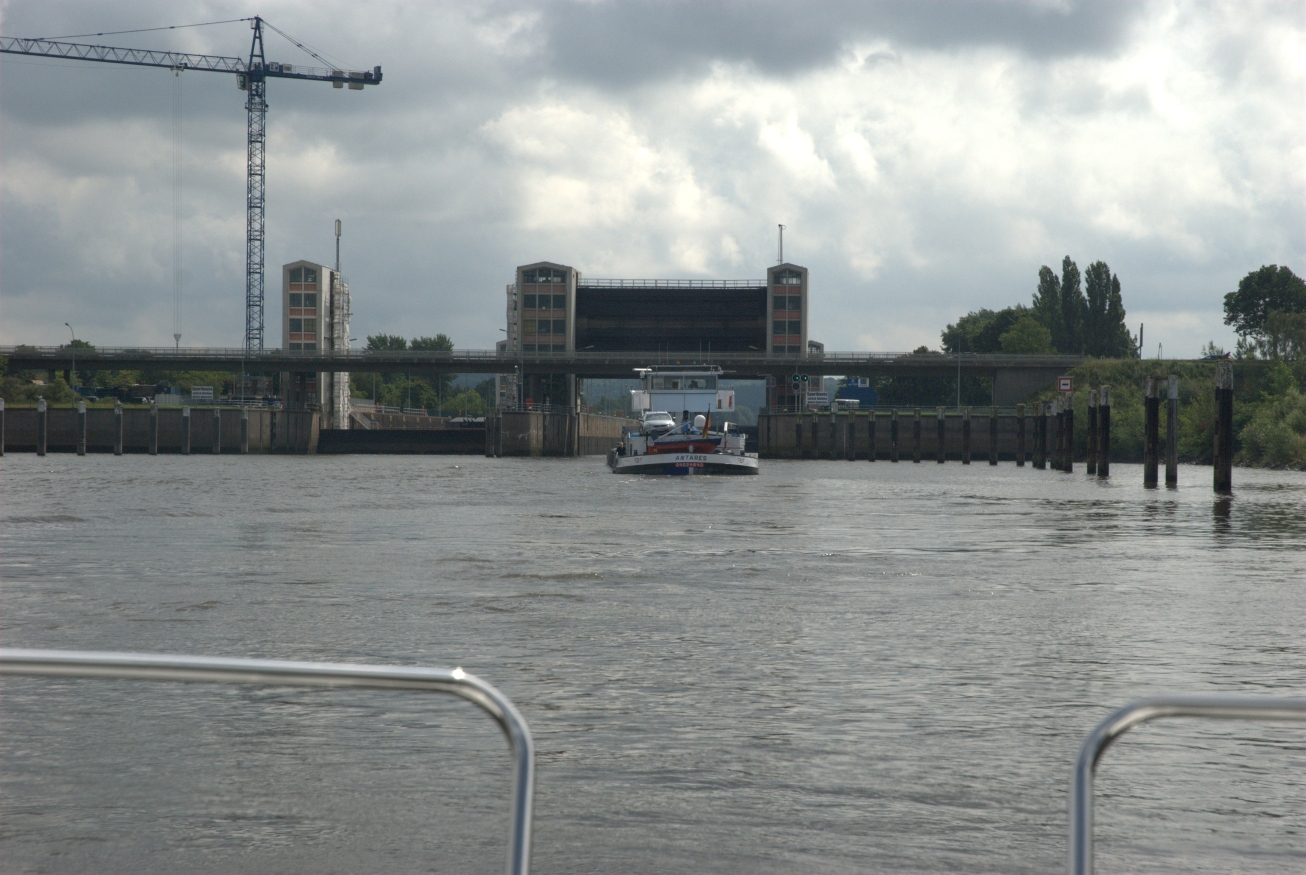 Nach längerer Wartezeit können wir mit einem anderen Schiff auf den Rhein abschleusen. Von der Schleuse geht es nun durch den Duisburger Hafen raus auf den Rhein.