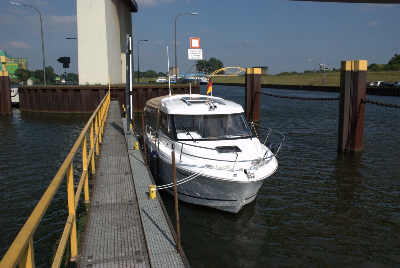 Davor liegt aber noch eine Schleuse, Anderten. Als wir uns über Funk anmelden heißt es, warten am Sportbootanleger. Der ist bereits voll, aber uns winkt der Skipper der ERGO heran und wir gehen bei ihm ins Päckchen. Nach nicht all zu langer Wartezeit, kommt die Durchsage über Lautsprecher und Funk, alle Sportboote mit in die Schleuse. Gerade sind zwei Berufsschiffe eingefahren und da sollen wir alle mit? Alle bedeutet, neun Sportboote unterschiedlicher Größe. Aber gut, wenn es so sein soll, wir folgen der Aufforderung. Hinter den beiden Dicken stellen wir uns dann auf, drei Reihen zu je drei Sportbooten. Im Päckchen zu schleusen ist für mich doch recht aufregend, habe ich das bisher noch nicht erlebt. Da wir in der erste Reihe in der Mitte liegen entfällt für uns diesmal das Leinen umlegen, auch nicht schlecht. Als die Ausfahrt freigegeben wird, lasse ich dann doch sicherheitshalber meinen Motor an, man weiß ja nie. Doch hier muss ich die Berufsschiffer loben. Die COSWIG vor uns hat natürlich gesehen, was da hinter ihr versammelt steht und hat sich wirklich „auf leisen Sohlen“ ohne Wellen etc. aus der Schleuse bewegt. Das finde ich wirklich klasse.