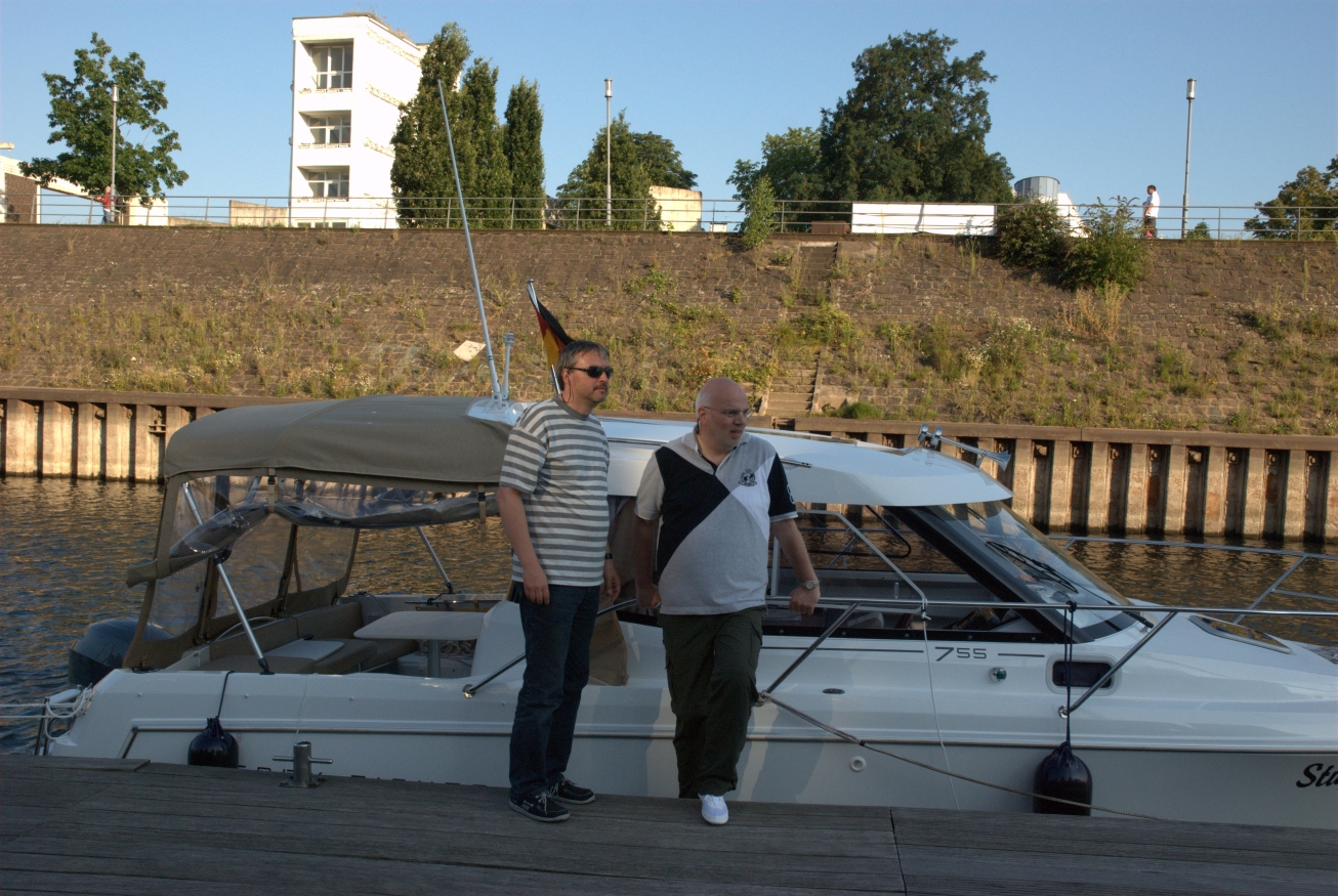 Als wir zum Boot zurück kommen, erwartet uns die Wasserschutzpolizei. Sie macht uns freundlich (und ich meine wirklich freundlich) darauf aufmerksam, das wir an dem Kanuanleger nicht bleiben dürfen. Wir legen also ab und machen an der Sportbootwartestelle gerade außerhalb der Kennzeichnung fest. Die Sportbootwartestelle befindet sich backbord an einer sehr hohen Spundwand. Die Lücken sind so groß, das selbst quer gehängte Fender fast darin verschwinden. Außerdem kann man nur an Land, wenn man zufällig an einer Leiter zu liegen kommt.