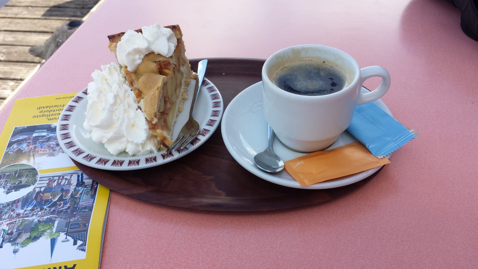 Ich räume derweil das Boot auf und mache es anschließend dicht. Mit Reika an der Leine mache ich mich auf den Weg zum Hafenmeisterbüro um die Formalitäten zu erledigen. Dort bekomme ich noch ein Informationsblatt zum Ort mit kleiner Karte, so das ich mich dazu entschließe den Ort zu erkunden. Der Weg dorthin ist recht hübsch, es geht an kleinen Kanälen entlang und durch Grünanlagen in den winzigen Ortskern. Wir kehren im Eetcafé De Cleef ein. Das Restaurant hat hinten eine Terasse direkt am Kanal auf der wir einen schönen Platz im Schatten finden. Ich bestelle einen Kaffee und Apfelkuchen, Reika bekommt eine Schale mit Wasser.